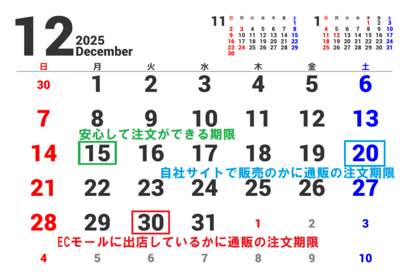 これは問い合わせしたカニ通販だけでなく、他の販売サイトなど確認した結果、2025年度は12月15日(月)が安心して注文ができる期限日です。