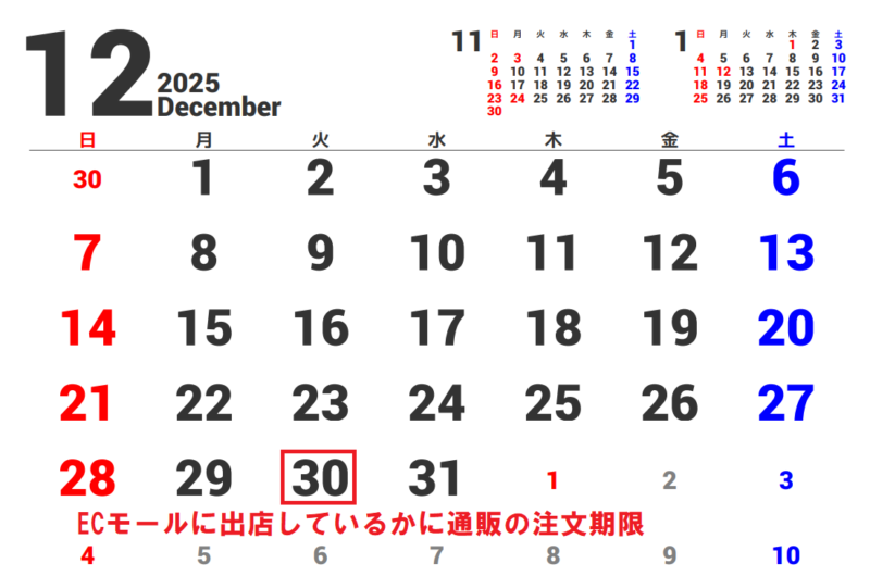 年末の30日まで注文が可能なサイトは、おそらくこれらを導入されているのでしょう。ですので自社サイトの発送よりも、グッとこのように注文期限が伸びます。