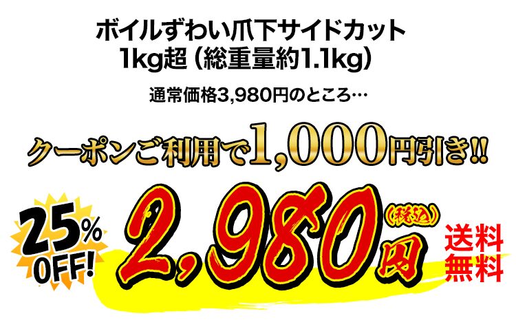 | 1位 | ボイルずわい爪下サイドカット1kg超(総重量約1.1kg) 【販売元:かに本舗、セール価格:2,980円】 | 〇 | 未定 |