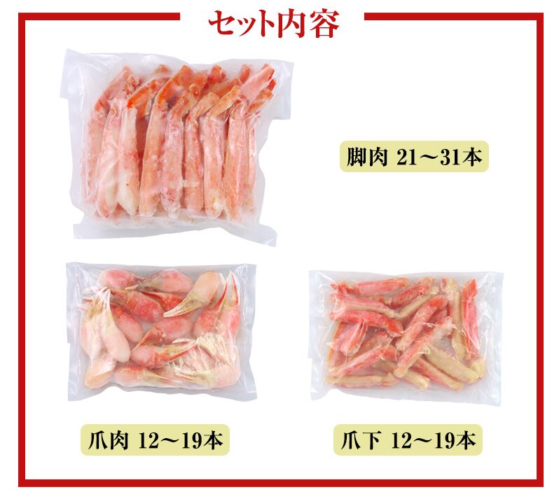 | セット内容 | 刺身用北海道産紅ずわいがに脚肉むき身 26~28本(約1kg) | ||