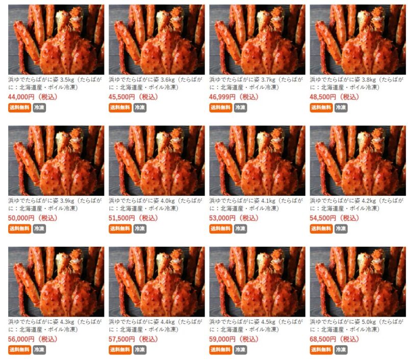 | 1位 | 浜ゆでたらばがに姿 5.0kg 【販売元:北海道ぎょれん、価格:68,500円】 | 〇 | 未定 |